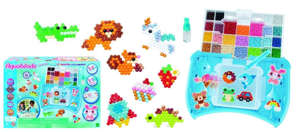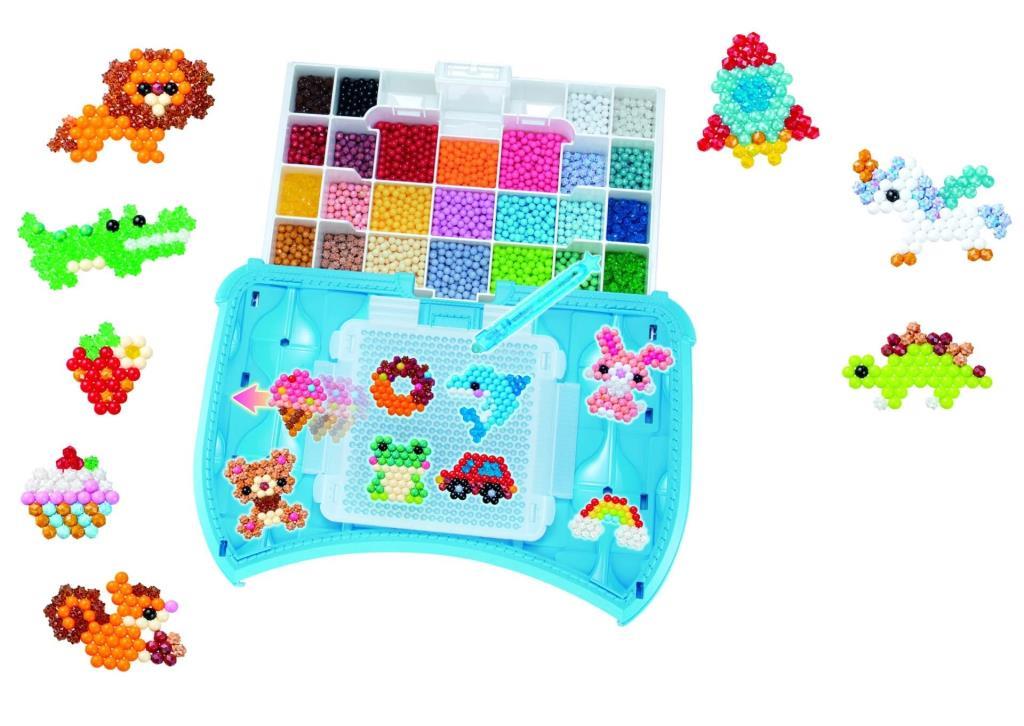 Kutu İçeriği: 25 renkte toplam 900 boncuk (15x klasik, 2x mücevher, 3x çokgen, 5x yıldız), 1x Boncuk Paletli Taşıma Çantası, 1x Tasarım Tepsisi, 1x Aquabeads Tasarım Kalemi, 1x Su Spreyi, 4x Tasarım Mandalı, 1x 2 Şablon Koleksiyonu, 1x Şablon Sayfası, 1x Kullanım Kılavuzu.