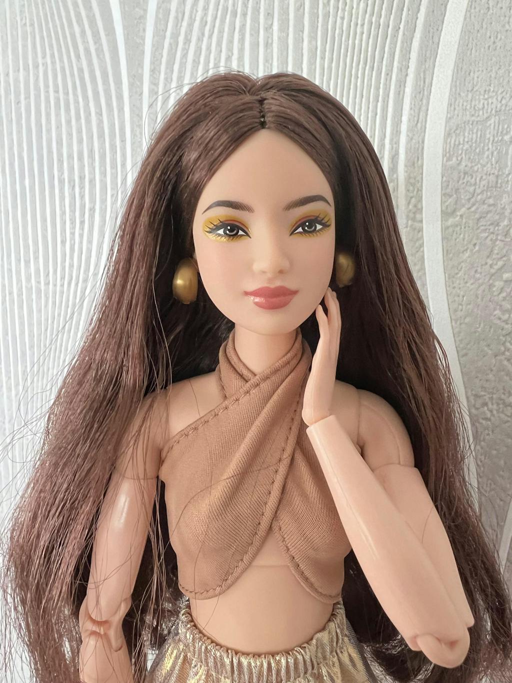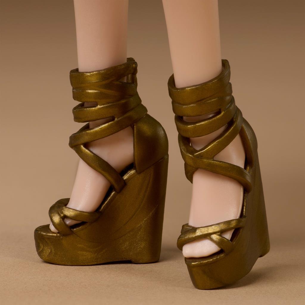 Barbie Basics Model 06 bebeği, ten rengi çapraz askılı ve bantlı platform topuklu, ışığı yansıtan altın rengi midi eteğiyle göz kamaştırıyor. Uzun, dalgalı kahverengi saçları, altın halka küpeleriyle uyum sağlıyor.