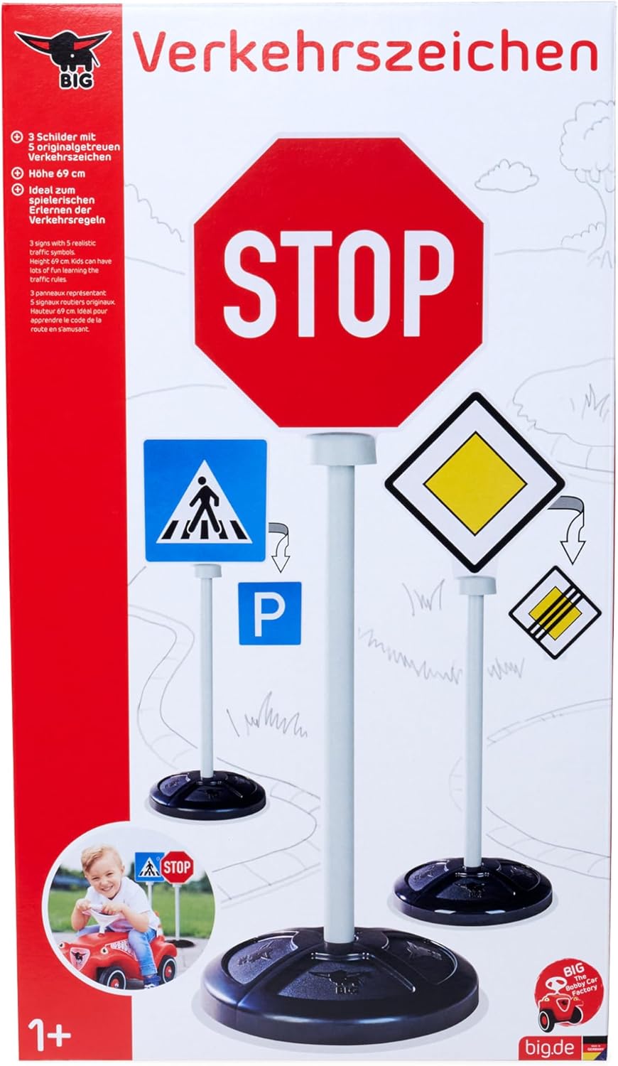 12 aylık ve üzeri çocuklar, BIG'in gerçekçi trafik işaretleriyle trafik güvenliği eğitiminin sadece önemli değil, aynı zamanda çok eğlenceli olduğunu da öğrenirler. BIG trafik işareti seti, toplam beş gerçekçi trafik işareti sembolüne sahip üç işaretten oluşur. Sette şu trafik işaretleri bulunur: Dur (her iki taraf), Ana yol / Ana yolun sonu, Park yeri / Yaya geçidi.