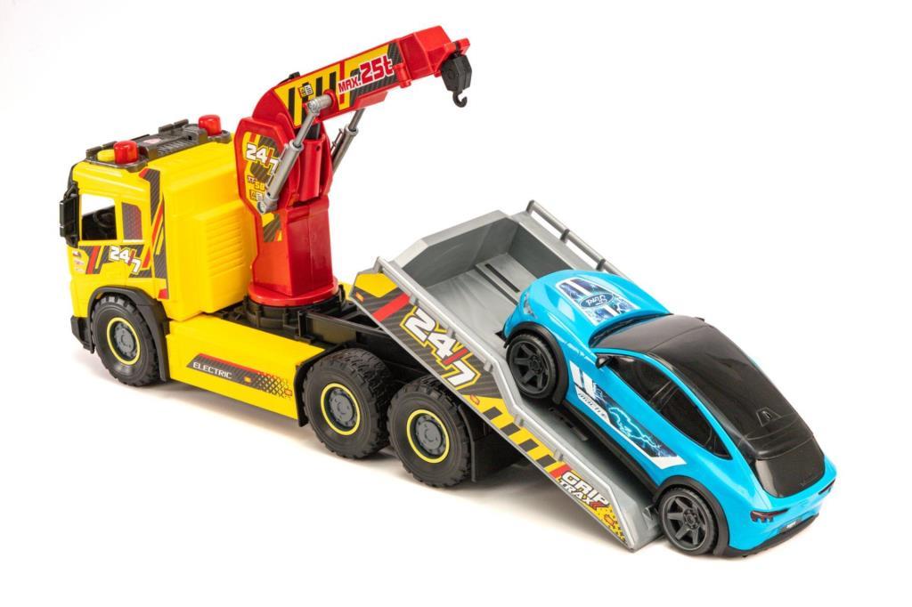 Manuel vinç ve özel devrilme fonksiyonu sayesinde küçük çocuk çekiciler için özel bir oyun aktivitesi görevi sunuyor. Paket içeriğine ek olarak Ford Mustang Mach-E aracı dahildir. Araç 1:16 ölçekli olup 54 cm’dir.