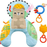 Karın üstü yatma süresi boyunca rahat bir destek sağlarken, bebeği hareket etmeye, başını kaldırmaya ve dünyayı tüm duyularıyla keşfetmeye teşvik eder. Hilal şeklindeki yastık, bebeğin göğsüne sağlam bir destek sağlayarak , kendini yukarı itme girişimlerini kolaylaştırır. Sevimli orman ayısı motifi, canlı renkler ve çeşitli dokular dikkat çeker ve keşfetmeyi teşvik eder. Merkezde, dokunma ve işitme duyularını harekete geçiren yumuşak kumaşlardan yapılmış büyük, hışırtılı bir panel bulunur.