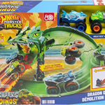 Testereli yönlendiricide onları üç sonuç bekler: İki kamyonun da geçmesine izin vermez, birini pistten atar veya ikisinin de kaçarak kötü ejderhayı yenmesine izin verir. Ejderha yere kapaklandığında çocuklar, kamyonları ağzına gönderip kupayı ele geçirebilir. 2 adet 1:64 ölçekli Hot Wheels Monster Trucks dahildir. Renkler ve süslemeler çeşitlilik gösterebilir.