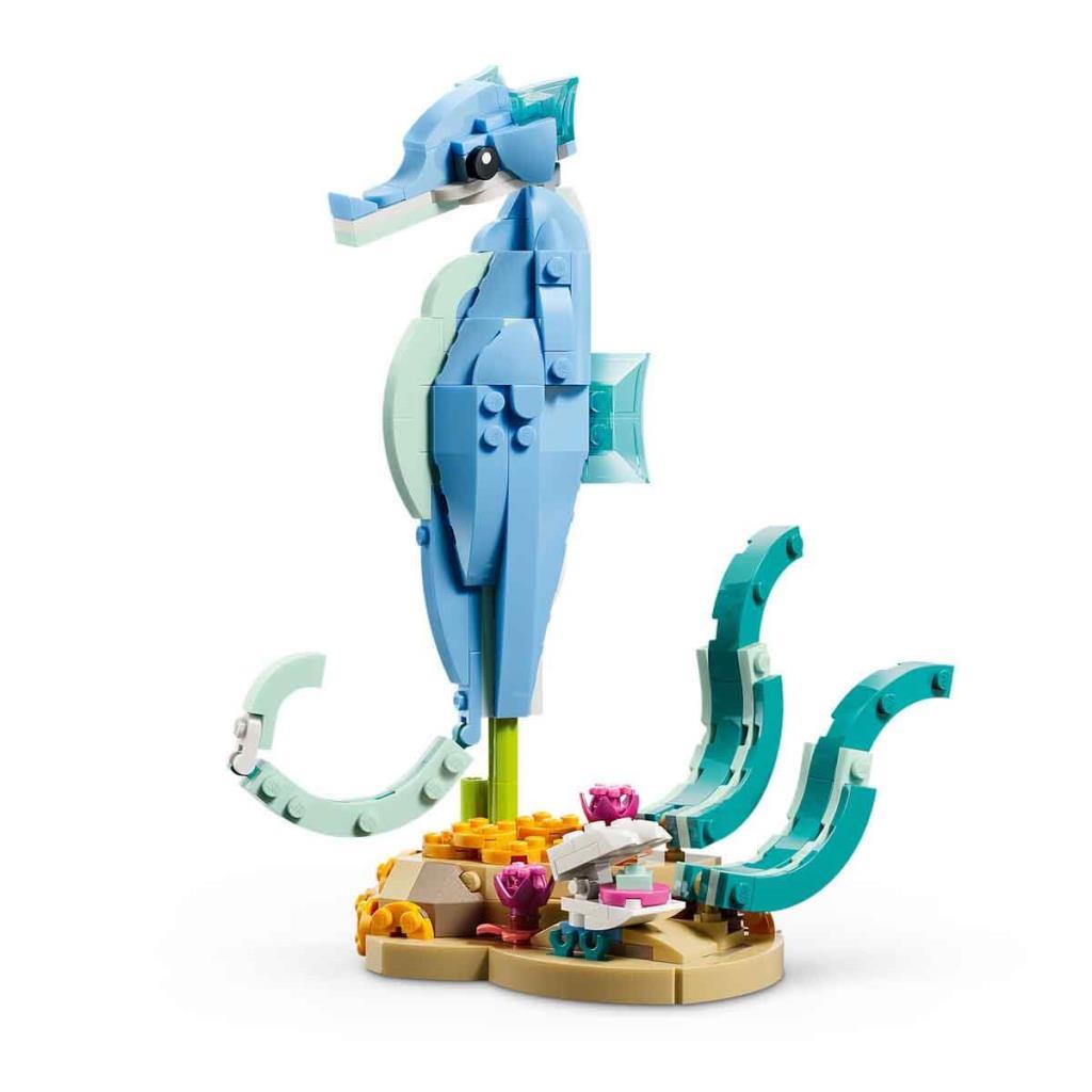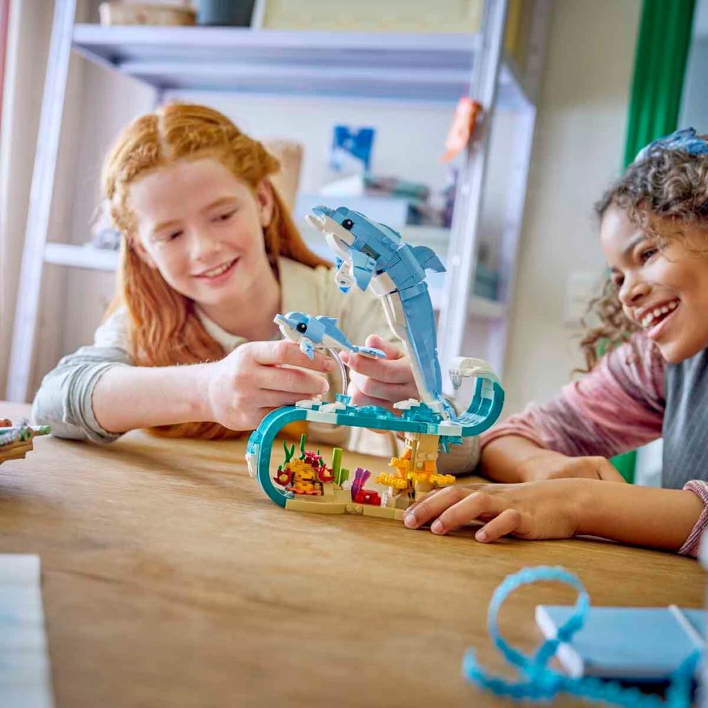LEGO Creator 3’ü 1 Arada Deniz Hayvanları: Güzel Yunuslar (31385) yapım seti, 9 yaş ve üzeri çocukların eğlenceli hikayeler oynamasını sağlar. Kız ve erkek çocuklara yönelik bu deniz hayvanı figürleri oyun seti, aynı yapım parçalarıyla 3 farklı model seçeneği sunar. Altında mercan olan dalgaya binmiş, duruşu ayarlanabilir bir yetişkin ve yavru yunusun dinamik bir modelini yapmayı seçebilirler. Daha sonra bu modeli, deniz yosunu ve duruşu ayarlanabilir istiridye içeren renkli bir stant üzerinde, duruşu ayarlanabilir bir denizatına ya da deniz bitkileri ve denizanasının yanında bir yengece dönüştürülebilir. Oyun zamanı bittiğinde bu modellerden her biri rafta ya da masada güzel bir doğa dekoru olarak gururla sergilenebilir.