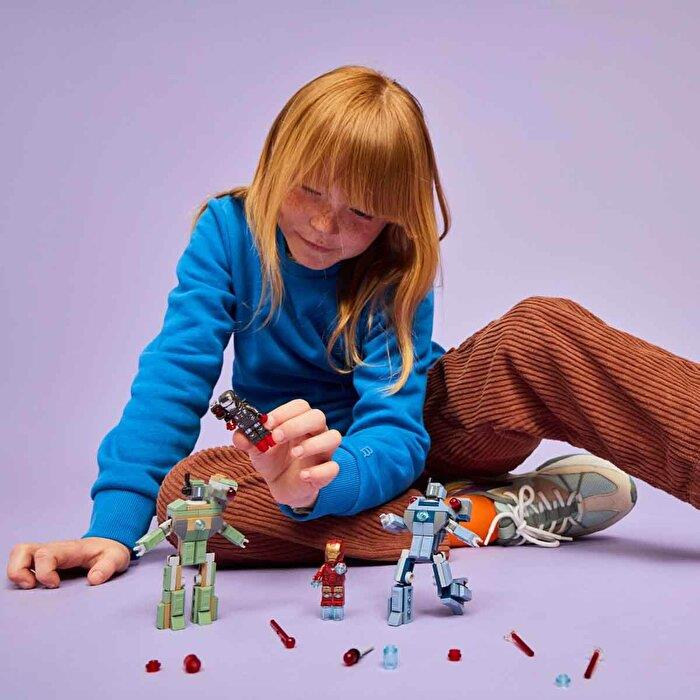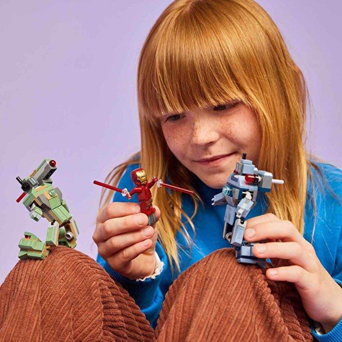 LEGO ǀ Marvel mini figürleri: Mavi el ve ayak silahları ve lazer ışını silahları olan bir Iron Man mini figürü, kırmızı el ve ayak silahları ve mermi atıcısı olan bir War Machine mini figürü içerir.