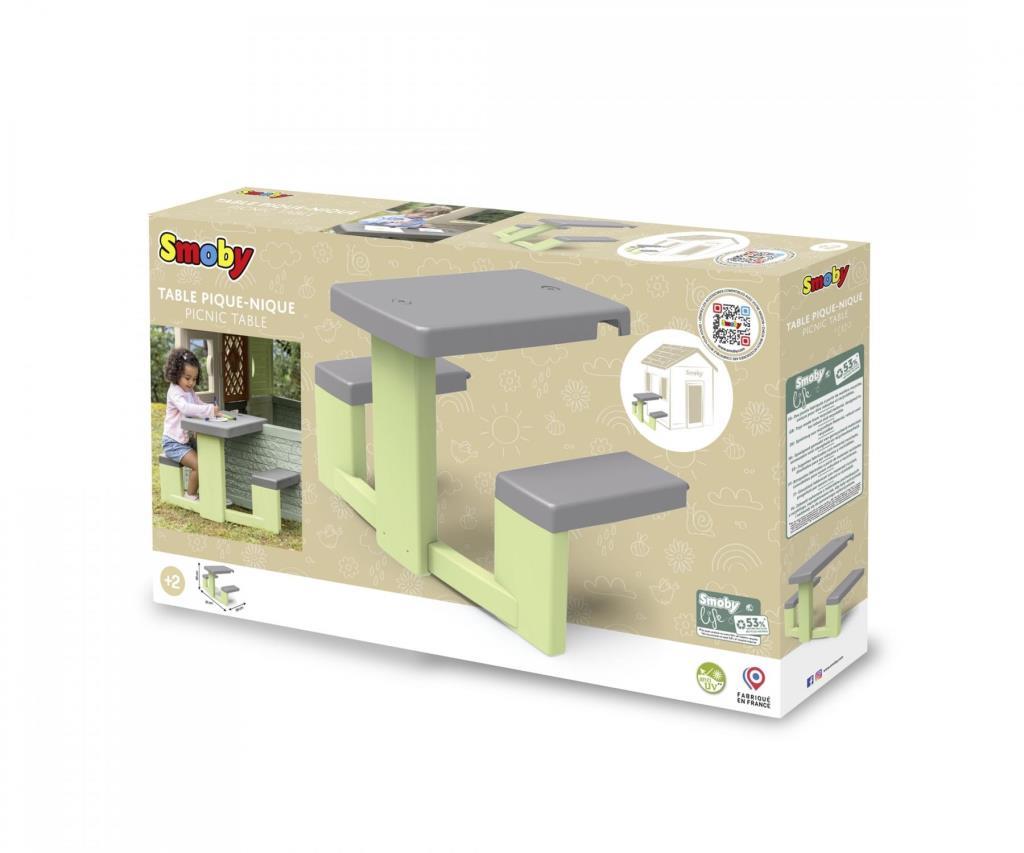 Piknik masası, Fransa'daki Smoby fabrikasında üretilmekte olup Smoby Life koleksiyonunun bir parçasıdır. Smoby Life ürünleri, geri dönüştürülmüş malzemeleri ve yüksek kaliteli yeni plastik granülleri akıllıca bir araya getirir. Önceliğimiz küçük maceracılarımızın güvenliğidir; özenle seçilmiş malzemeler, dayanıklılık ve sağlamlık arasında mükemmel bir denge sağlar.