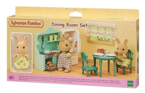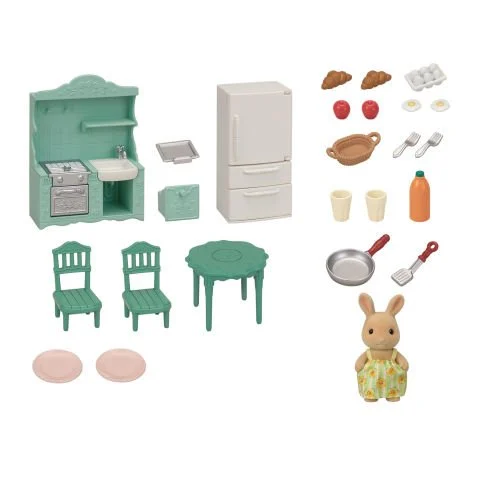 Yemek Odası Seti 1 adet Güneşli Tavşan Kız figürü, 1 adet küçük mutfak ünitesi, 1 adet buzdolabı, 1 adet yemek masası, 2 adet sandalye ve çeşitli mutfak aksesuarlarından oluşur. Figürün başı, kolları ve bacakları hareket ettirilebilir.